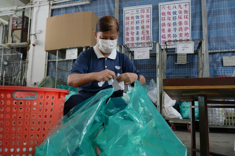 Ms Lucy Ng engrossed with her recycling work at the Tzu Chi Eco-Awareness Centre. (Photo by Chan May Ching)