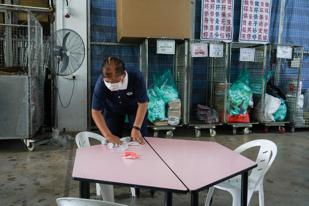 The volunteers have already left for the day but Ms Lucy Ng continues to remain behind at the Tzu Chi Eco-Awareness Centre located in Woodlands. With one hand holding a wet cloth, she goes around wiping and disinfecting the areas that the volunteers have come into contact with during the course of the day. Due to the COVID-19 pandemic, extra precautions have had to be taken for the safety of everyone. While this also means extra work for Ms Ng, it does not seem to bother her, as she continues her duties without a hint of complaint.