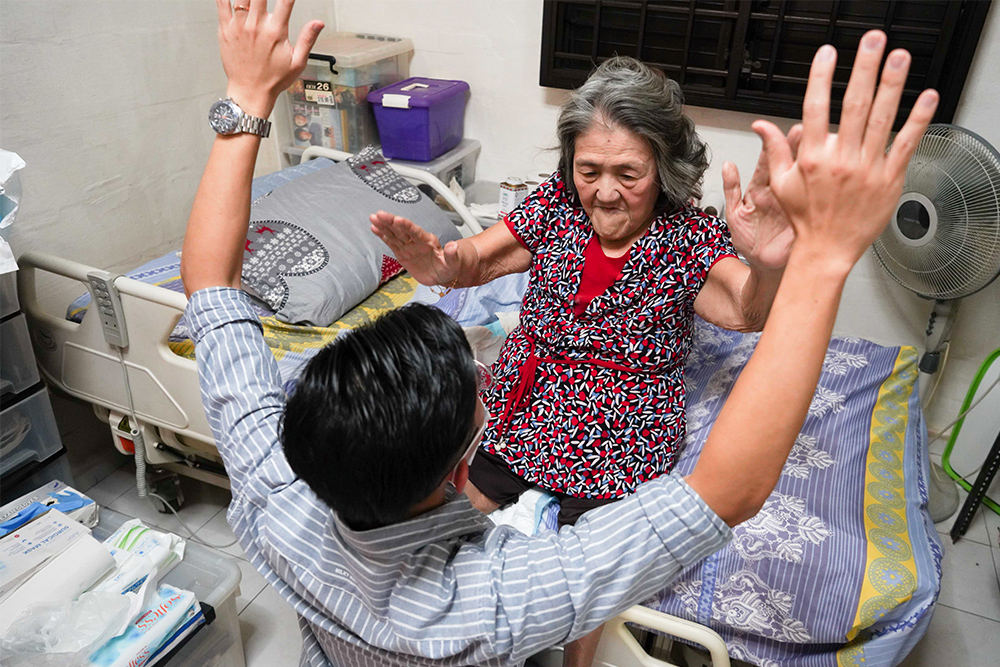 Madam Toh was initially reluctant to leave her bed, so the physiotherapist, Lim Beng Kooi, encouraged her to start with simple bed-based rehabilitation training to help boost her confidence. (Photo by Chan May Ching)