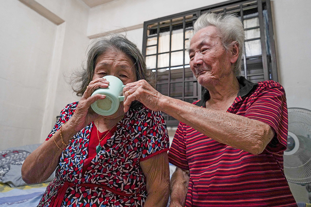 Madam Toh has been bedridden since her fall, unable to perform tasks such as making breakfast, bathing, and doing laundry. Throughout this time, Mr Toh has been patiently waiting and caring for her. (Photo by Chan May Ching)