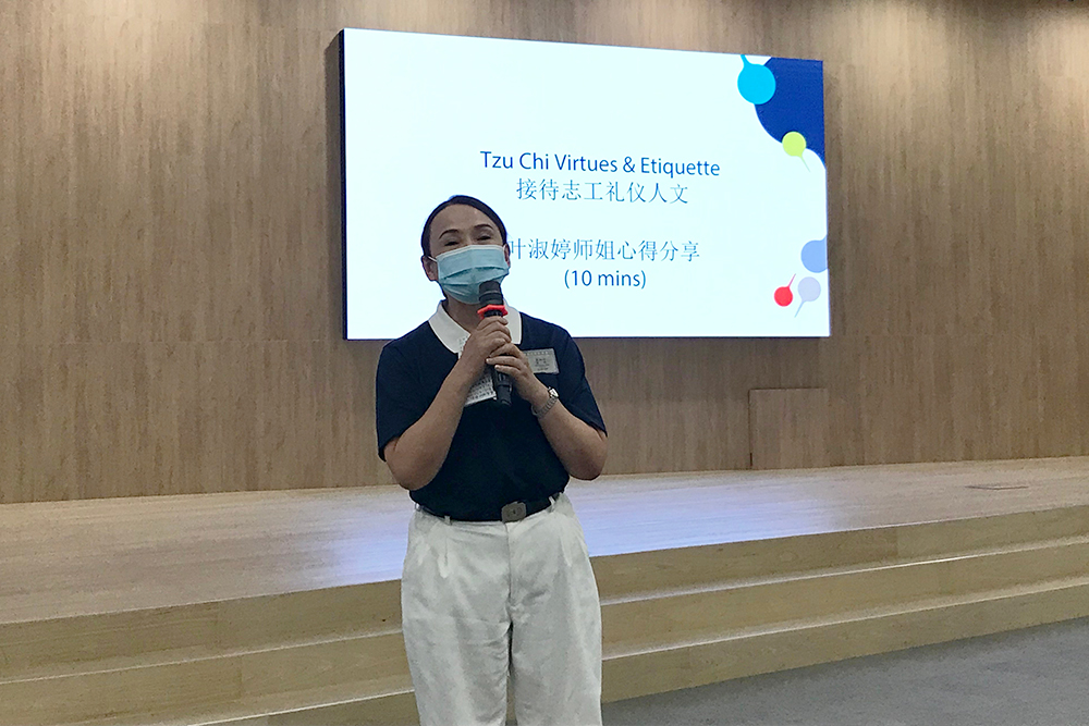 Yap Sook Ting, a certified Tzu Chi volunteer who has been with Tzu Chi for more than ten years, shared with the volunteers tips on how one could receive members of the public. She mentioned how first impressions are paramount, and volunteers must look proper from head to toe. Not only must they be properly attired and look neat, but they should also greet visitors with a smile. In addition, she shared how volunteers need to be courteous, know their limits when interacting with others, and seize the opportunity to share about Tzu Chi with visitors wherever possible.