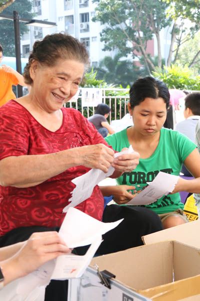 At the recycling point, volunteers saw elderly resident Wu Ya Rong lug along a heavy pile of clothing and enquired how she managed to collect so much old clothes.