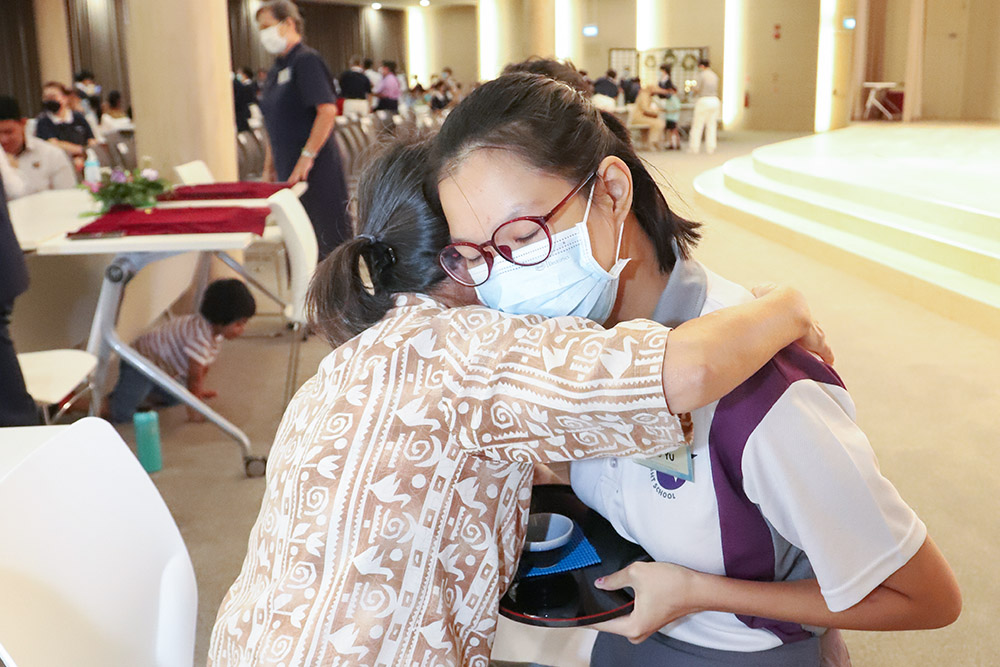A parent giving her child a hug after accepting the tea offered by her child. (Photo by Chua Teong Seng)