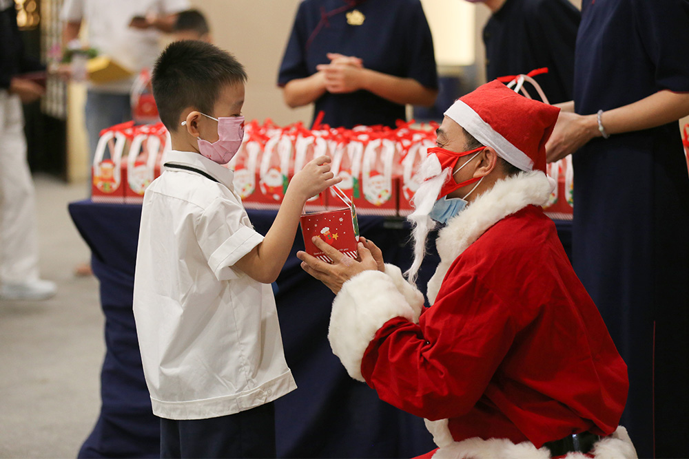 “Santa Claus” distributing gifts to everyone at the end of the ceremony to spread love and joy on Christmas Eve. (Photo by Chua Teong Seng)