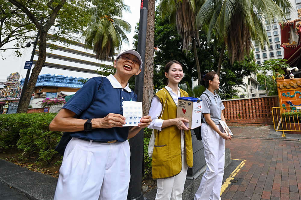 On the streets and alleys of Singapore, Tzu Chi volunteers hold donation boxes in their hands to appeal for kindness from the public. As the weight of the boxes increases, it reflects the boundless love of people in Singapore.