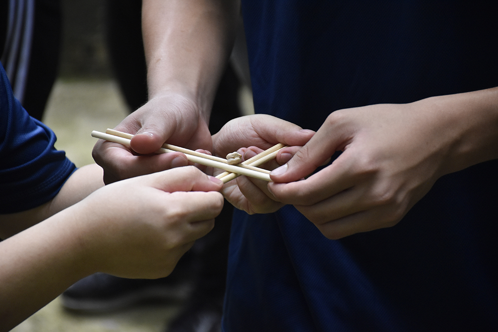 The challenge of picking up glass marbles using chopsticks prompts the teenagers to work cohesively as a team and not feel discouraged when facing obstacles. (Photo by Chong Mong Zhuang)