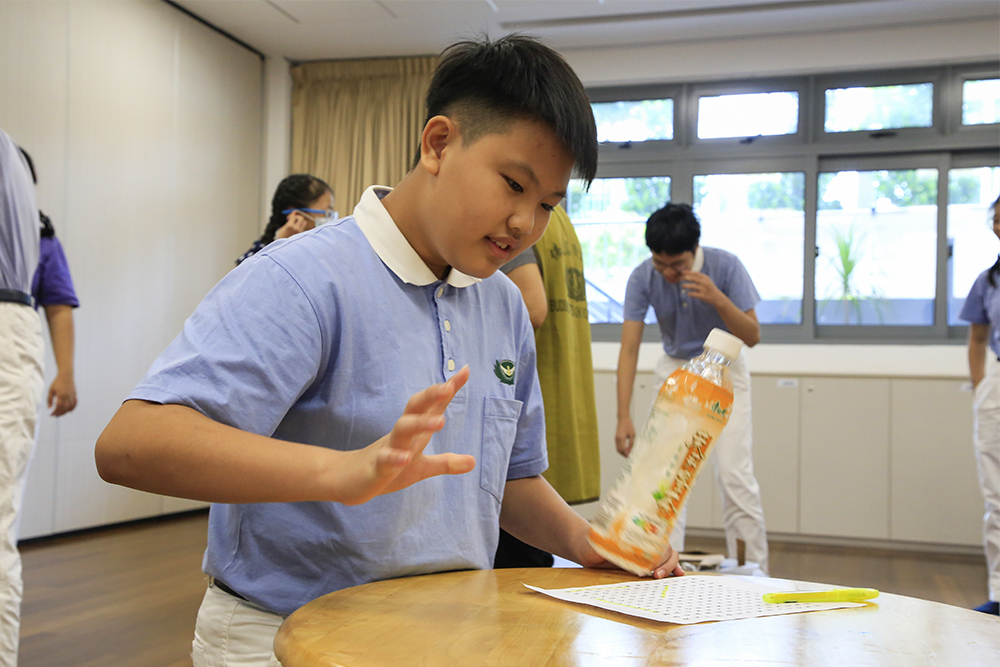 Flipping the bottles is harder than it seems. The game has drawn the students to grow closer to each other and driven them to learn sharing and caring. (Photo by Fong Kwai Kin)