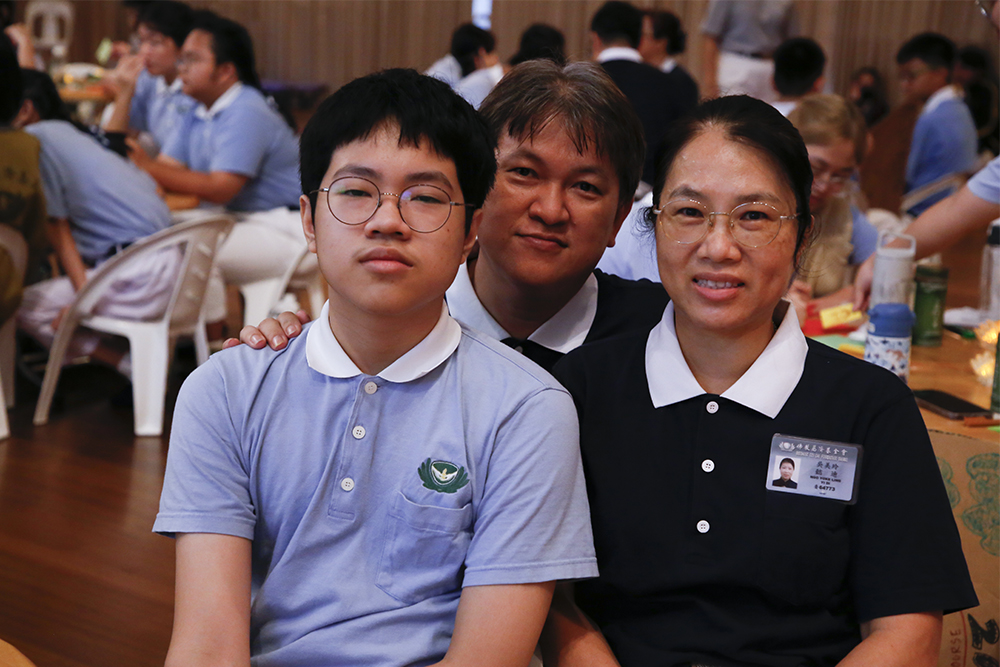 Accompanying their son Ngui Jia Zheng (left), Ngui Chang Yong (middle) and Ngo Yoke Ling volunteer as camp facilitators for the Tzu Shao activity to learn how to love their children with the heart of a Bodhisattva and get along well with their children. (Photo by Fong Kwai Kin)