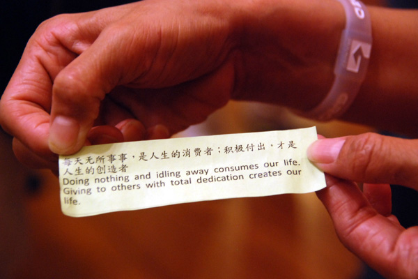 另一名会众白金美说,她刚刚抽到的静思语是“每天无所事事,是人生的消费者,积极付出才是人生的创造者。”她觉得这句话让她有很深的体会,因为说中她自己现在没有工作。“所以我觉得应该要找一些事做,不要做人生的消费者。”