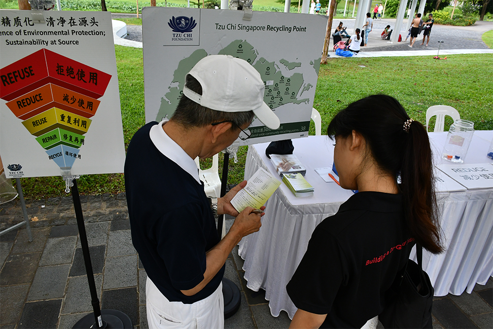 身为合作伙伴之一的新加坡慈济,除了在终点站的分类区引导民众亲自进行分类,也负责环保5R的宣导(Refuse, Reduce, Reuse, Repair, Recycle)。志工耐心地宣导:“大家要注意看清楚喔!肮脏的纸巾是垃圾喔!”