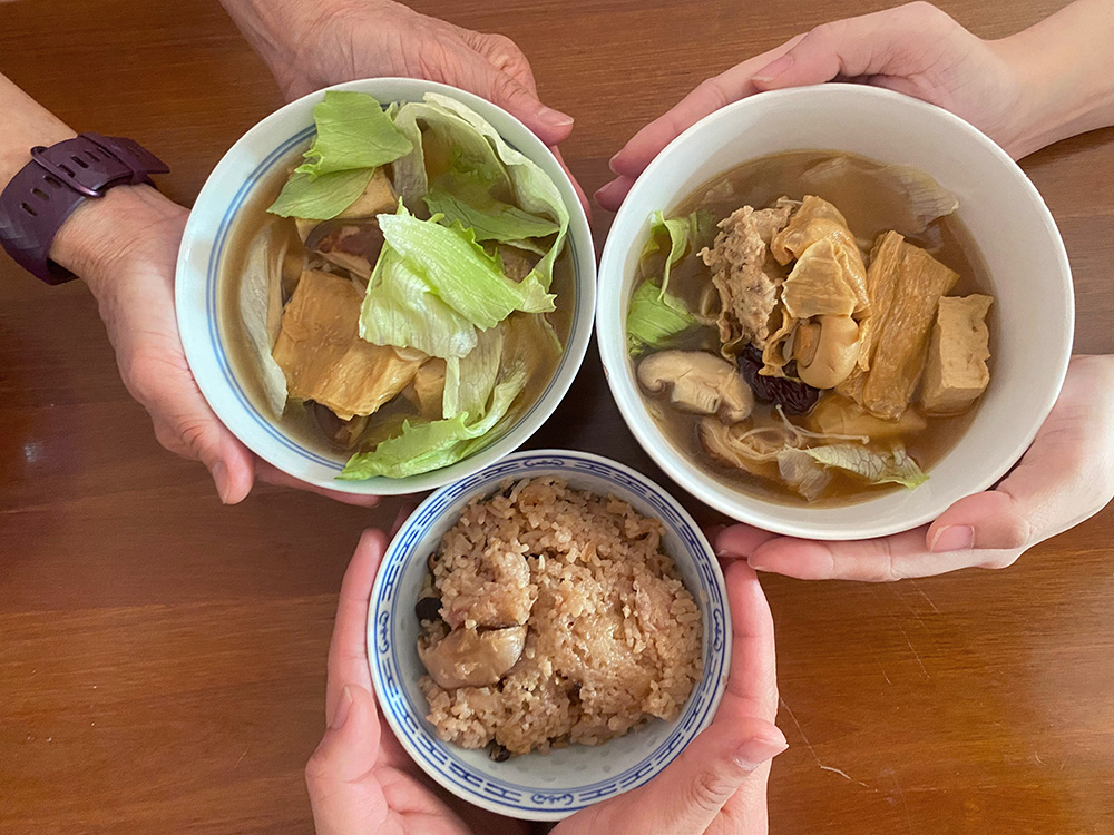 这一天“蔬食小厨”端上桌的是南洋美食素古茶和芋头饭,大家在温馨共餐中分享煮素、吃素的乐趣。(摄/ 陳倩雯)