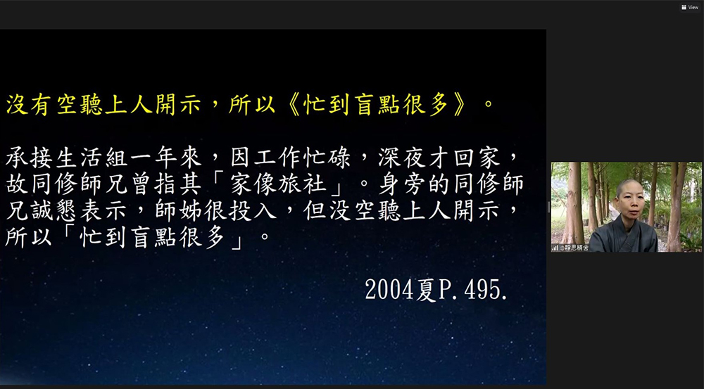 释德劭师父从台湾花莲静思精舍连线,为新加坡慈济干部开示菩萨团体的修行。(荧幕截屏/ 黄思妮)