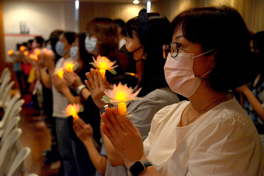 在志工引领下,会众高举莲华心灯,为天下苍生祈福。(摄/ 潘宝通)