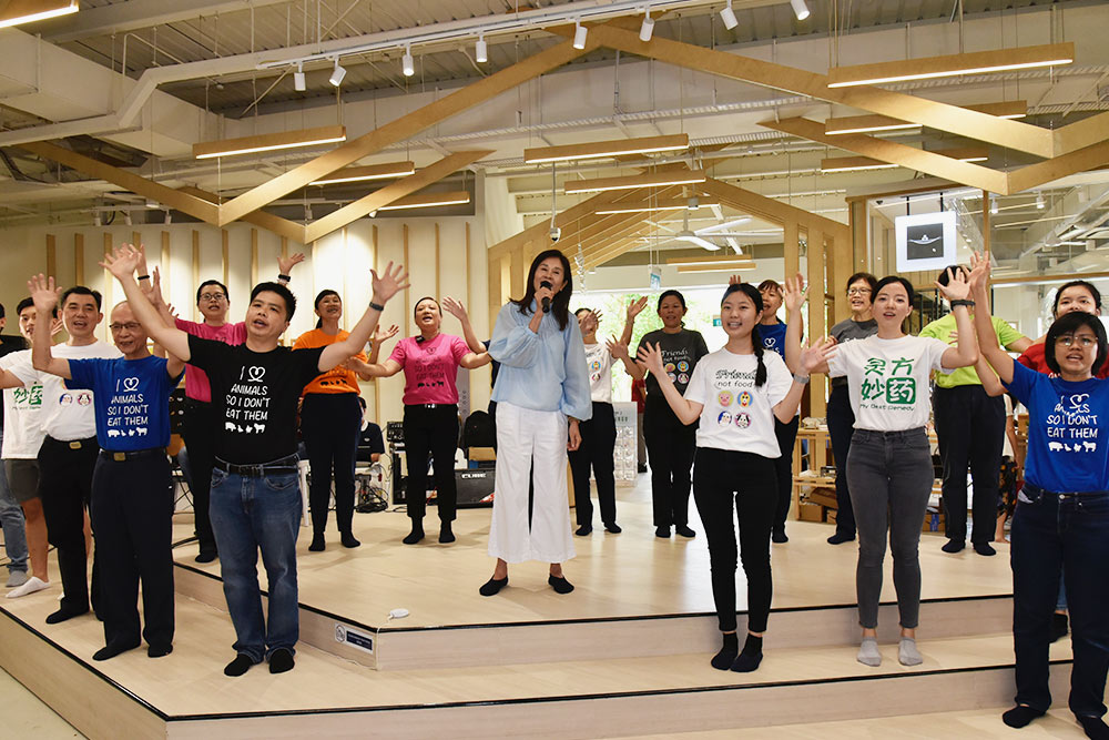 “人的一生,守口最难, 改变习惯,并不简单,诚心发愿,一定有力量!”林梅娇和志工充满活力地演唱《蔬素翻转新生命》。(摄/ 伍书永)