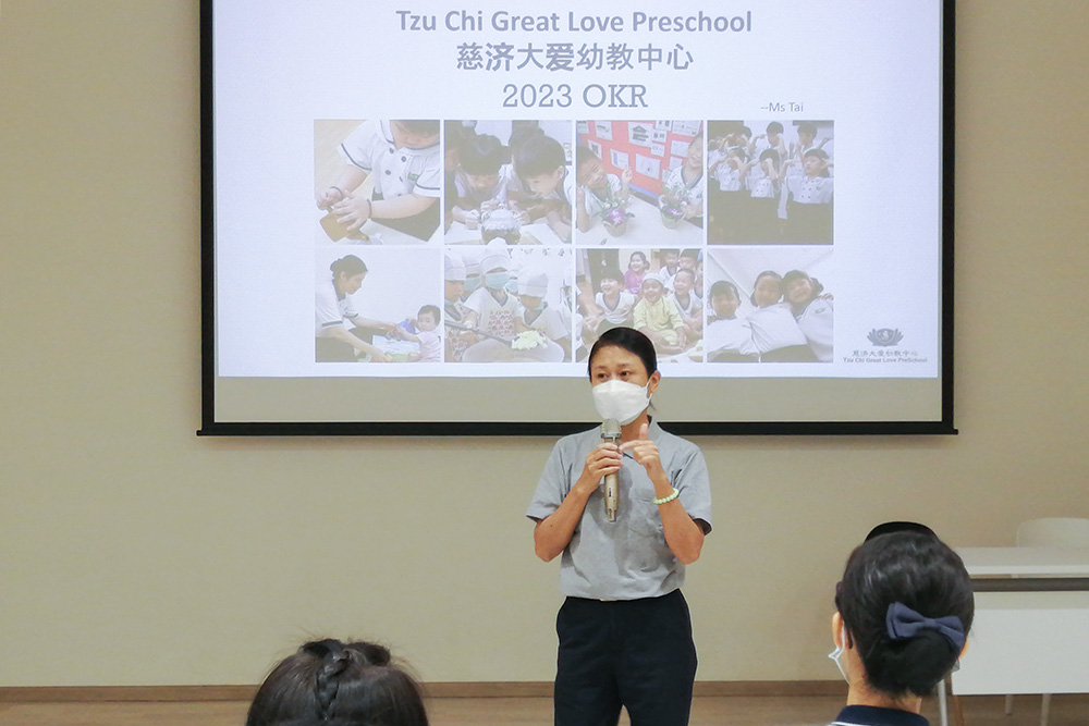 藉由开放式交流凝聚全校共识,新加坡慈济大爱幼教中心每年12月举办共识日,全体教职员与行政主管集思广益。2022年12月16日,教育志业发展室主管戴钰郿带领28位管理人员和教师,就幼教环境设施到课程内容的方方面面,盘点过去教育成果,立下来年展望。