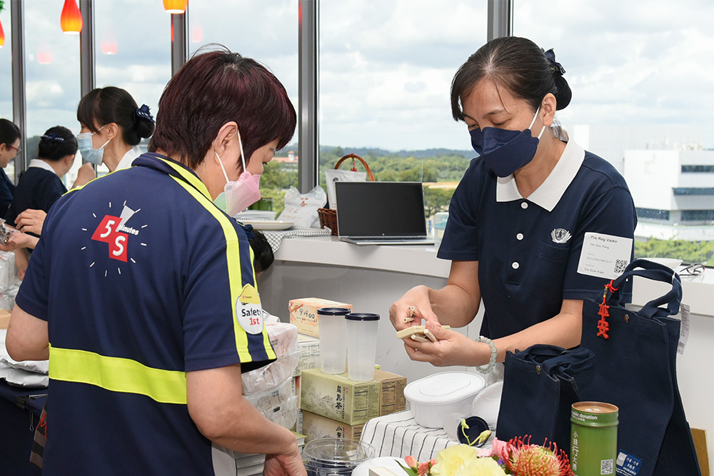 在静思人文推广区,慈济人向员工介绍“环保五宝”,包括环保杯、碗、筷、手帕及环保袋。