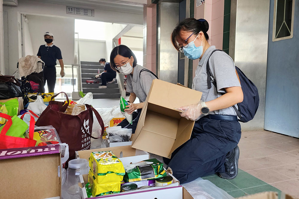慈善发展室职工在电梯口蹲下来,仔细分类整理法蒂玛家中囤积的食物。(摄/许淑美)