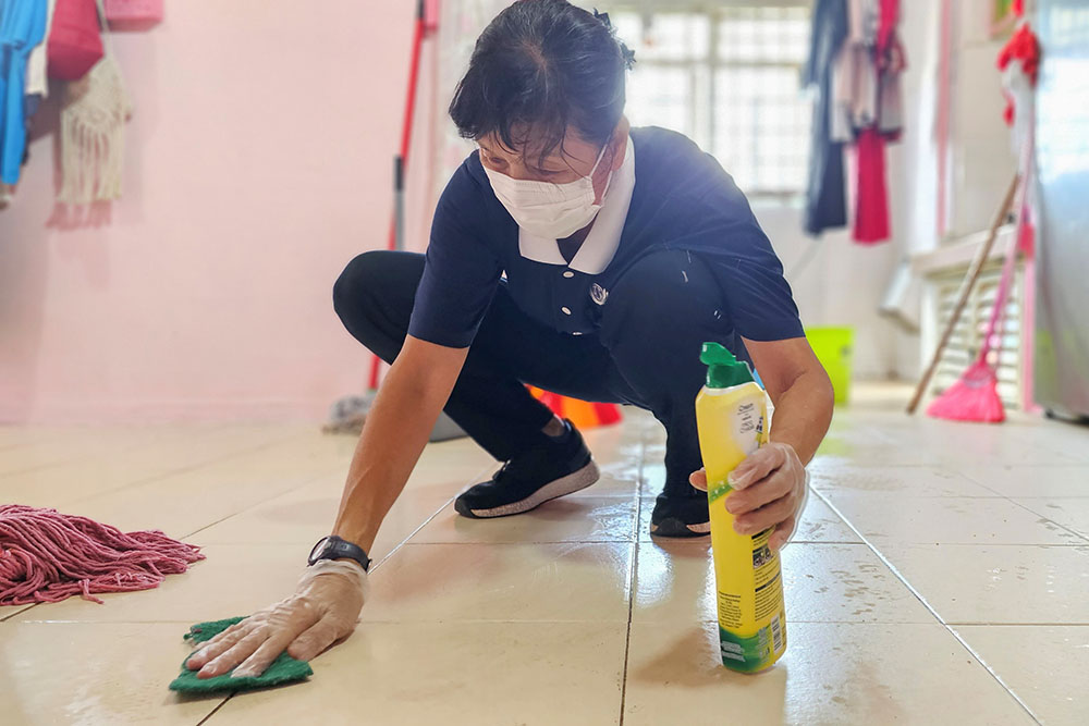 2023年5月1日,志工趁假日来到宏茂桥一间租赁组屋,为无力清扫家居的单亲母子打扫房子。(摄/ 许淑美)