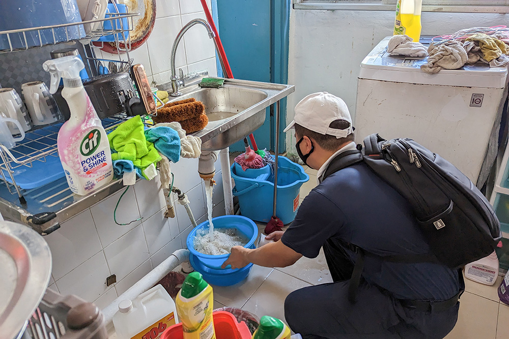 志工发现厨房水槽堵塞,他们细心地从水槽下方清理,让阻塞物顺利流出。(摄/ 杨雯婷)