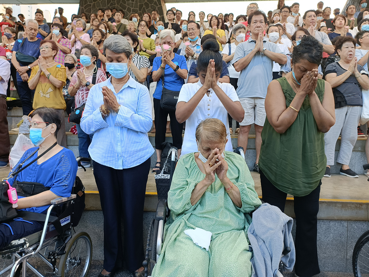 56位诸山长老和法师在众人恭迎下缓步入场。来自兴都教、佛教、道教、耆那教、伊斯兰教和巴哈伊教的六大宗教代表,带领全场会众虔诚默祷。在这个疫情未消、天灾战乱频发的时刻,人人不分种族宗教,共同祈愿世界和平,祈求天下无灾无难。
