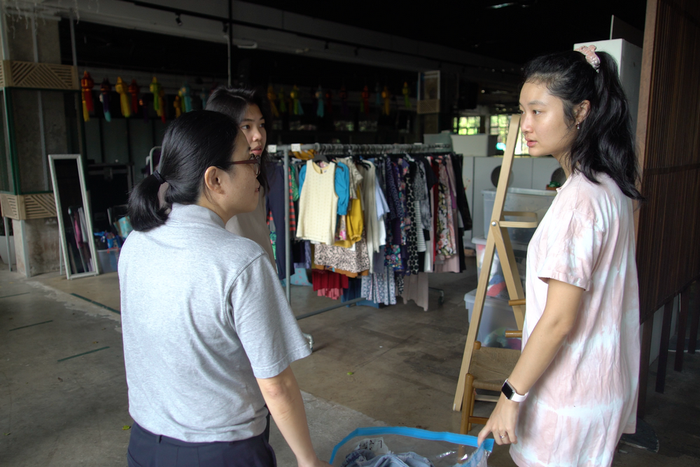 Cloop联合创始人陈银铃(右)与策展团队商讨用于展馆的二手衣物事宜。(荧幕截屏/ 蔡宝玲)