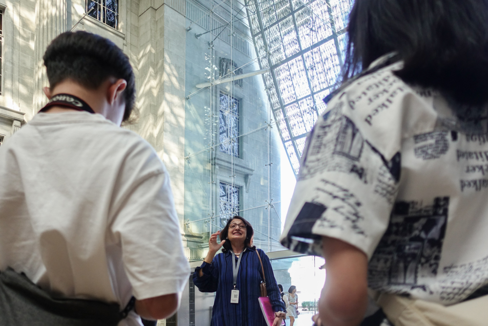 “从镜头看人生”计划希望透过让年轻人用镜头记录职场百态,探索非传统的职业道路。青年学员在导览员带领下,学习欣赏观察国家美术馆的独特建筑风格。(摄/ 陈雪晶)