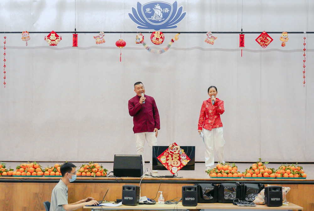 志工比往常提早三小时抵达,精心布置多功能礼堂,希望把新春的喜悦与满满的祝福带给四十多位院友。